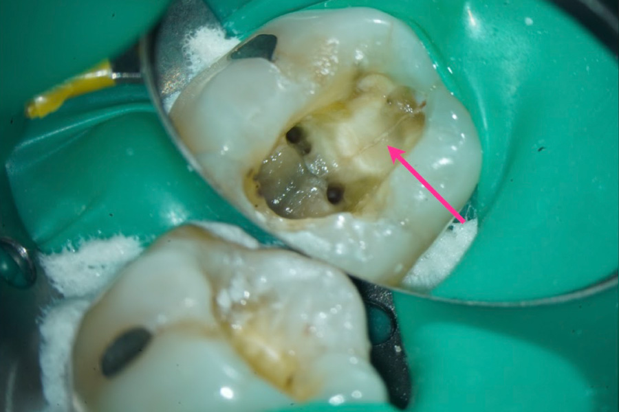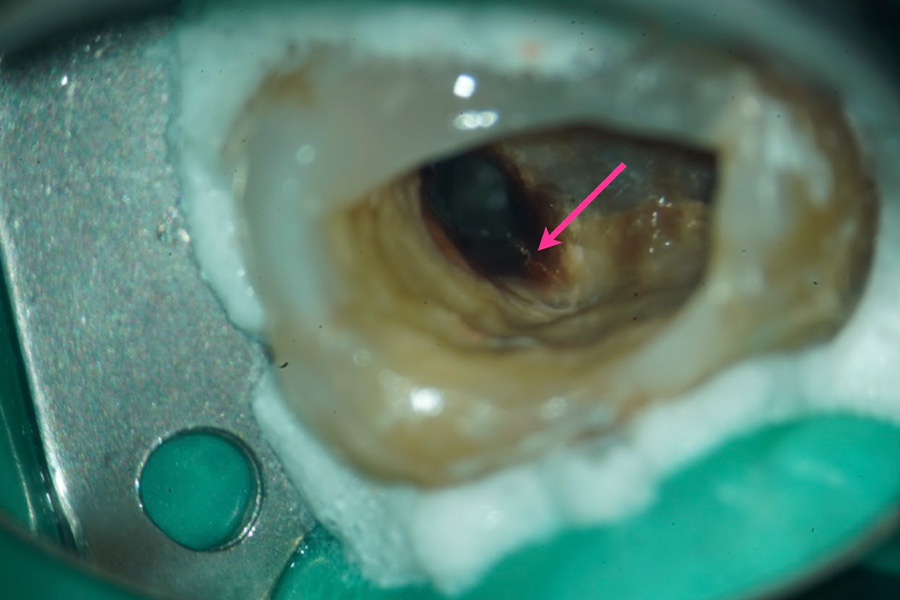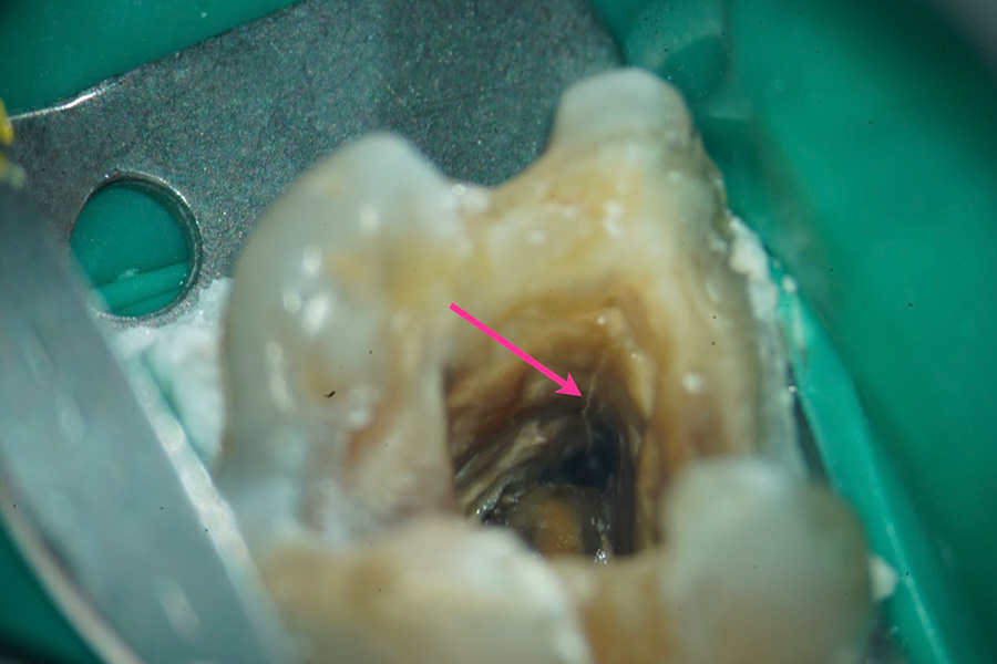 詰め物(充填物)を慎重に除去し内部を確認したところ、歯の神経の部屋の底(髄床底)から後ろ側にかけて、はっきりと破折線(割れ目)が入っているのを確認しました。長年患者さんを苦しめていた不調の原因が確定し、抜歯の診断となりました。