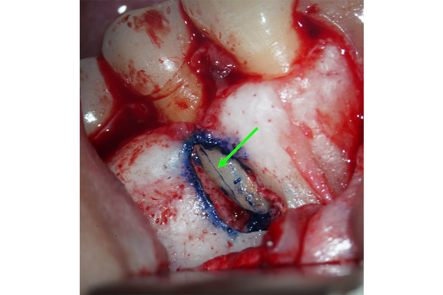 患者さんが「現在のジルコニアブリッジを外さずに治療したい」とご希望されたため、歯茎を開いて直接根の先からアプローチする「歯根端切除術」をご提案しました。手術時、マイクロスコープを用いて直接根の状態を確認したところ、頬側の根の先(根尖)まで真っ二つに至る垂直性の歯根破折を発見したため、現状をお伝えし抜歯となりました。
