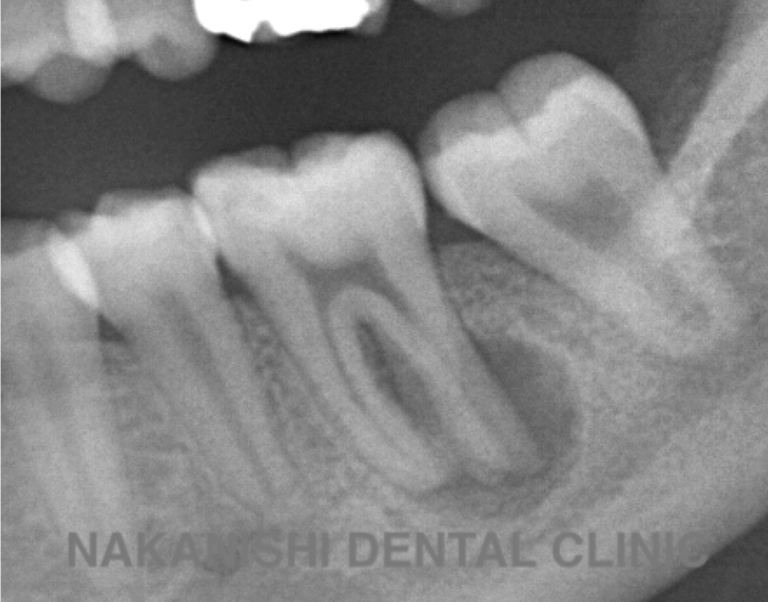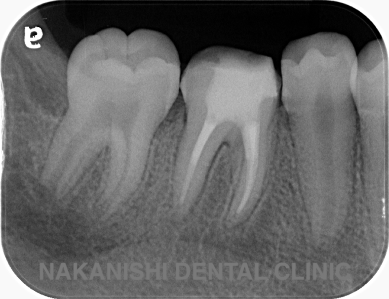 | 治療内容 | 前医ではラバーダム不使用であったため、ラバーダム、マイクロスコープ下にて根管治療を施術。 痛みは消失したが腫れは治らなかったため、意図的再植を行い腫れは消失した。治療後のレントゲンは意図的再植後3年経過したもの。 |